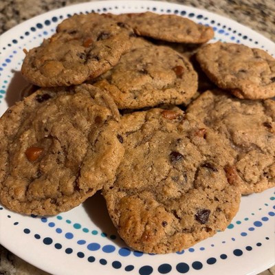 This cookie has a fantastic taste with all the different flavors that are combined. The walnuts have a great crunch while the melting chocolate and peanut butter chips gave a good amount of sweetness. They were cooked for about 16 minutes while seated on the pan for 2 minutes and I would suggest cooking them for longer unless you love under cooked cookies. Highly recommend this cookie!