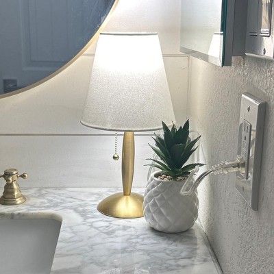 This lamp is the perfect size for a bedside table. It doesn't take up much space but still provides just the right amount of light. I love the little pull chain to turn it on and off— it's a simple detail, but very convenient. The brass finish looks great and adds a nice touch to the room. Overall, it's a great lamp for a nightstand.