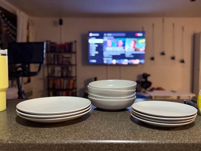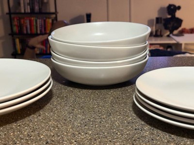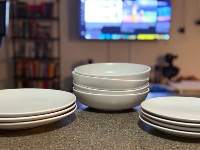 [This review was collected as part of a promotion.] This dinnerware set came in very protective packaging. Each plate and bowl was separated and wrapped individually- they were in pristine condition when I got them out of the box. I love this dinnerware set. They are stoneware, but unlike most stoneware, they are very lightweight and surprisingly durable. The plates and dishes heat very well and the food always comes out heated evenly. The plates are very easy to clean, all you have to do is pop them in the dishwasher. The white color goes with everything and the design is minimalistic and timeless. I can see myself having this set for many years to come.