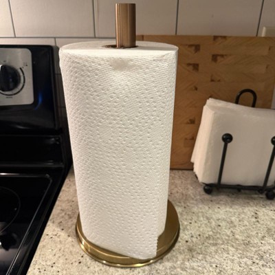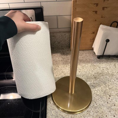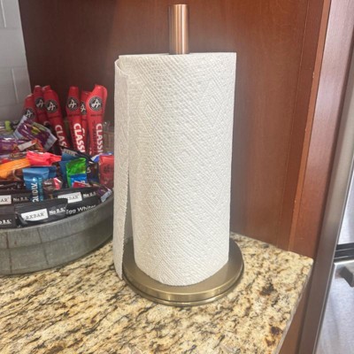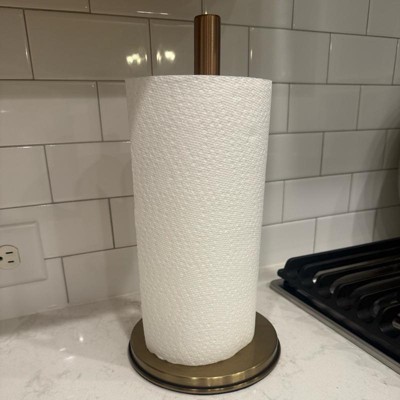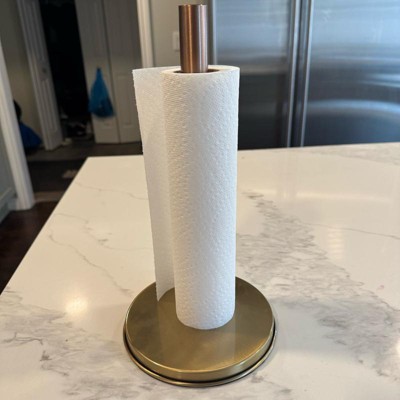 The quality of this paper towel holder is very good. It’s heavy so it won’t tip over easily. I did not like the two tone of the design. The stick part is copper and the base is gold which threw me off a little bit. The bottom is nice and flat so it sits nicely on any surface. I think that it’s sold on the higher price end.