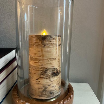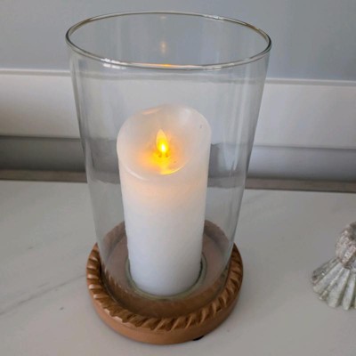 I picked this candle holder up online and it is very nice! I love the combination of the clear glass hurricane with the warm wood base and it fit my flameless candle perfectly! The carved detail around the base gives it just enough character without being overdone. It’s very sturdy and holds pillar candles perfectly. It looks great on its own or paired with other décor, and works well for everyday use or seasonal decorating.