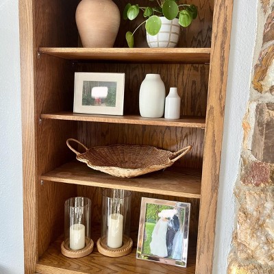 I am absolutely delighted by this wood and glass hurricane candle holder. The combination of warm wood and clear glass create a beautiful aesthetic that compliments my decor perfectly. It’s sleek design is both functional and stylish, making it a perfect centerpiece for coffee tables, mantles, shelves, or side tables.