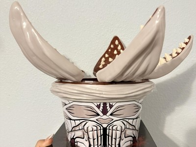 It’s an amazing bucket for $20 but the down side the mouth with teeth pop off and come apart its really no biggie it’s a cheap bucket it’s not movie theater bucket quality. I suggest never using it just because it’s the chance it will pop off. I did end up ordering one online. I did try to do a pick up in store but it was open and already coming apart. So I ordered it to never open it and just have it on display with my open bucket.