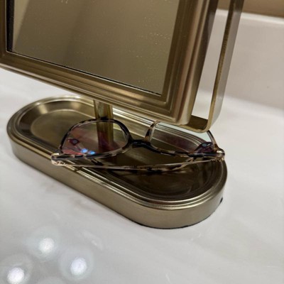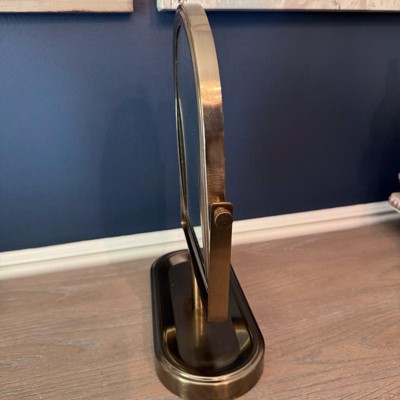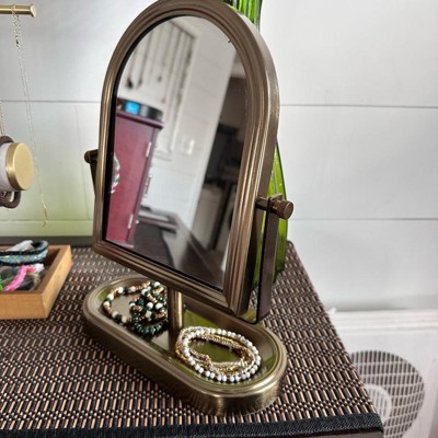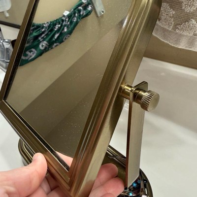 I really love the appeal of this vanity mirror. The design is so cute and I love how you can adjust it. The base has a little bit of a dip in it where you can store, hair clips and other items the frame that holds the mirror together is Welcome together and gives great stability to the mirror. It’s a beautiful rustic gold color.