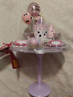 [This review was collected as part of a promotion.] My daughter was so excited to play with this because she is constantly having birthday parties for all her dolls. It comes with a table,balloon stand, 3 balloons, 1 party hat, 2 place mats, 2 plates, 2 cups, 2 spoons, 2 name tags, 1 cake stand, 1 birthday cake with topper and candle and 3 cupcakes. The balloons have some weight to them so I had a little trouble keeping them up. Overall it’s a cute set that my daughter loves.