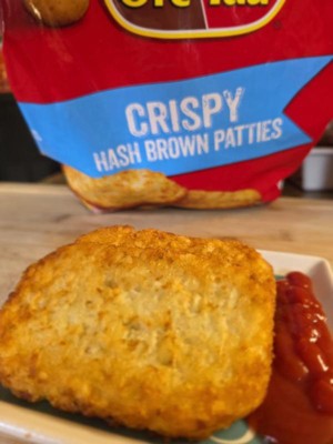 [This review was collected as part of a promotion.] I cooked it using the air fry selection 400 degrees for 10-12 minutes. I was quite pleased when I pulled it out and put it on my plate but when I took a bite I was immediately disappointed. The other side of the hash brown was still pretty raw. I haven’t had Ore-Ida since I was a teenager and stopped eating their items because they either never fully cooked or burned. I dint like the fact that the package wasn’t resealable, I don’t think people enjoy the freezer burnt food. I took them all out of their original bag and had to put them in a gallon size ziplock just to store them. Maybe I’m too picky but I am going to pass on this in the grocery store.