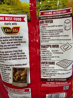 [This review was collected as part of a promotion.] The Ore-Ida Crispy Hash Brown Patties are so good. I put mine in the air fryer and it turned out nice and Crispy on the outside and still juicy on the inside. This is a large bag, and the value you get for the price of this bag is really great. You really get a lot for your money. It is not oily at all, and just the perfect amount of saltiness in them. It did not burn when I cooked them in my airfryer unlike the other brands I have tried before. Overall, I am very impressed with these. It is so convenient and easy to prepare. The packaging is awesome and it is really a bang for the buck. I will keep purchasing these. I am excited to try the other flavors/cuts.