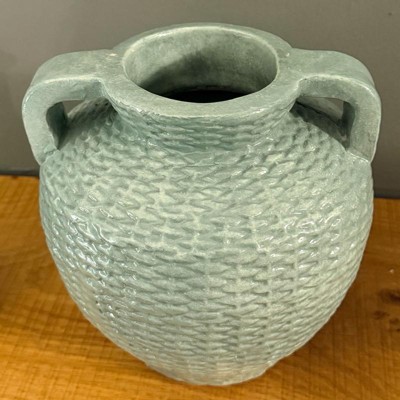 Elevate your space with the elegant look of this Small Woven-Texture Ceramic Vase from Threshold™ designed with Studio McGee. Featuring an all-over basket-weave pattern in blue, this vase adds an artisanal feel to any tabletop or shelf. The rounded body, narrow neck, and dual handles create a beautiful amphora-like shape, and the watertight construction allows you to fill it with fresh stems if desired.