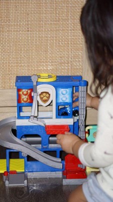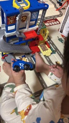 [This review was collected as part of a promotion.] This is a very cute playset if you have a younger (3+) Paw Patrol obsessed kid. It's a small playset so it doesn't take up lots of space, no worrying where to store it when it's time to clean up but there's lots of play area. There are four levels with a helipad on the roof, a garage on the bottom, a little elevator, and a ramp to ride the cars down. The set comes with three figures: Mayor Humdinger, one of his cats, and Chase in a car. There is also a little cart that connects to Chase's car. There's space for four cars to park in the little garage area and the floor slides out so each car can drive out. There could have been a little more detail paid to the paint on the figured (cat's collar and Mayor's body all solid colour with no detail picked out like the collar) and the little cart is one solid piece of molded plastic so there are no wheels so it doesn't 'drive' Overall it's a good set and my kids have been having a lot of fun playing together.