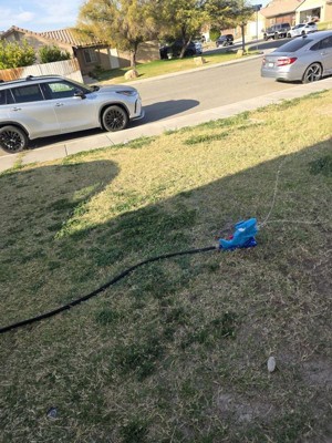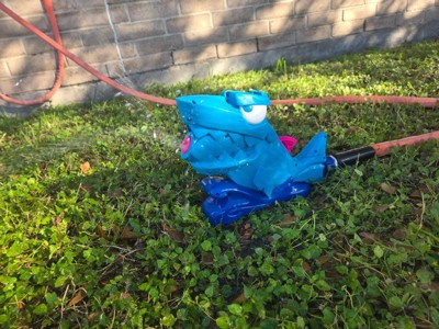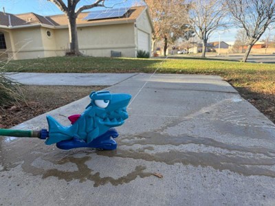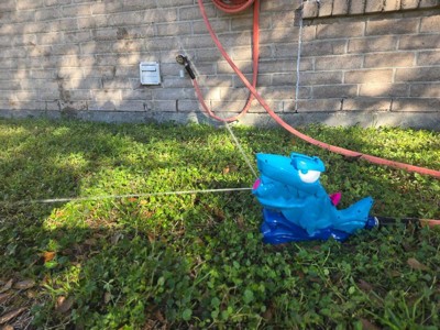 [This review was collected as part of a promotion.] Just got this and it’s bigger than I thought it would be. We took it out box and plugged it to hose just to see how far it sprays. And it goes pretty far. The two water lines rotated pretty good. I did find if the water pressure was too hard the shark would fall in the grass , it may be better if it would be situated on cement to level it