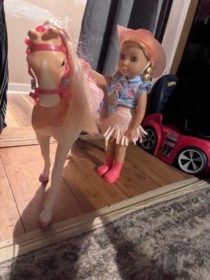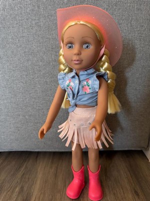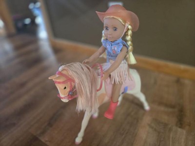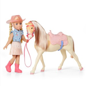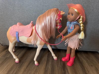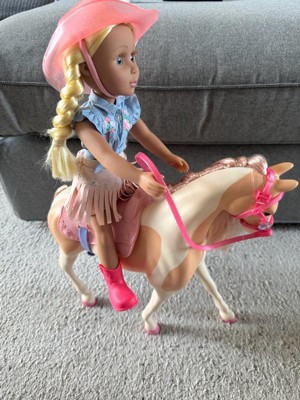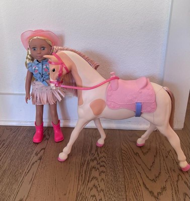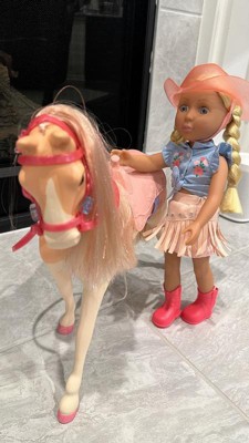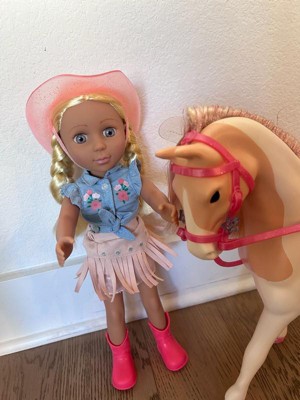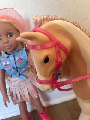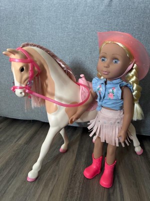 [This review was collected as part of a promotion.] This is a nice playset for pretend play. It comes with the horse (Silver) and the 14 inch doll (Sadie). The doll has a full cowgirl outfit, complete with hat and boots, and ready to ride the horse. The details are super cool, like the braided hair in Sadie, or the glitter hair in Silver. You can remove accessories from both horse and doll, and the doll can bend legs / actually ride the horse. My kids were very excited about this toy, particularly about the horse. The doll size is 14 inches, so somewhere in between the smaller and bigger dolls. That said, horse and doll seem to have the proper scale and size. Just bear in mind that you may want additional accessories - the doll size is somewhere in between most accessories we already owned.