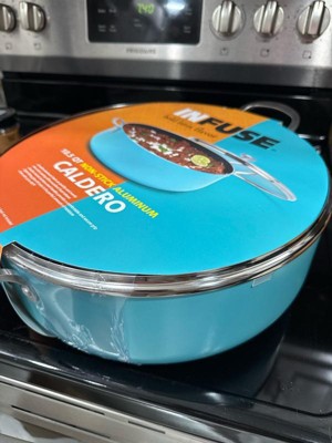 [This review was collected as part of a promotion.] Wow, this Infuse Latin 10.5 qt Nonstick Aluminum Caldero Saute Pan is HUGE! I I love that this has a wider base, giving it more surface space for even heating. Any of my bigger pans are tall, so everything takes a long time to heat thoroughly. With this wide base with curved bottom, I'm able to quickly and evenly cook so many things. The options are endless. The nonstick surface makes cleanup a breeze. The cover is heavy duty with a steam hole. The knob on the cover is thick and sturdy. The 2 handles are attached well with no movement. I'm in love with the aquarium color. This has quickly become a staple piece of cookware in my house.