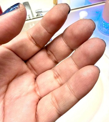 Leaves behind black residue. Looks like you just dyed your hair black. Stains fingers