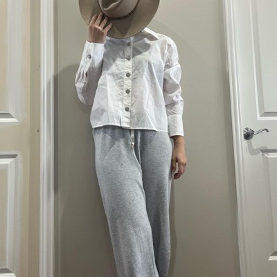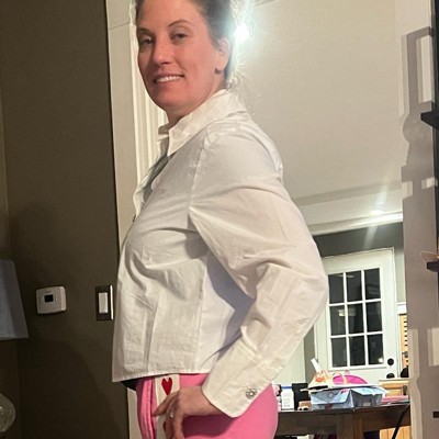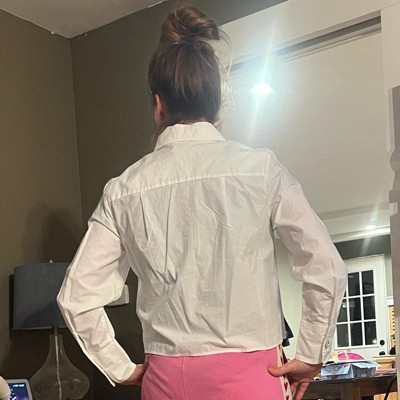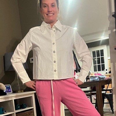 This stylish white button-down is perfect for dressing up a casual outfit or wearing to work. I’m 5 foot four. 34C. 25 at the waist and 33 at the hips. The cut of the shirt is short so a little hard to tuck in, unless you’re wearing high waisted Pants. The sparkle buttons are a very nice touch. I could see myself wearing this end of some thing I recommend.