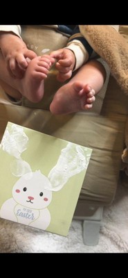 [This review was collected as part of a promotion.] This is such a great quality product, I just wish there had been some sort of notice about the foot size it accommodates. I loveeee this canvas, but my 7mo’s feet covered the bunny’s face. 🤣 I still plan to use this to decorate every year because it’s kind of funny, but this is definitely intended for smaller feet. The paint was THICK and washed off easy. I love this so much, but if your baby is gigantic like mine, you’d benefit from a disclaimer!