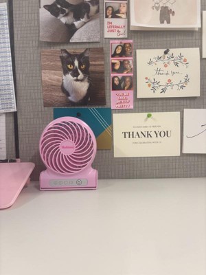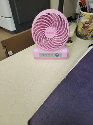 [This review was collected as part of a promotion.] This compact freestanding fan works really well with three power settings. It's super cute in the pink color and fits in a small corner on my desk. After running for an hour my whole office feels cooler. One thing I wish were better was the charging indicator. It doesn't let you know that it's running low, it just stops working once it's run out of battery. It does work while being charged and after approx 30 minutes if charging I was able to take it off the cord and have if run without issues. I recommend this cute little desk fan if you have a hot office like me!