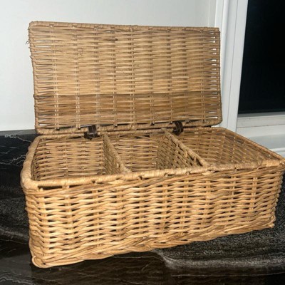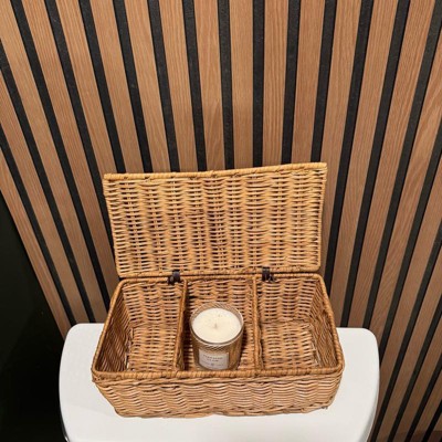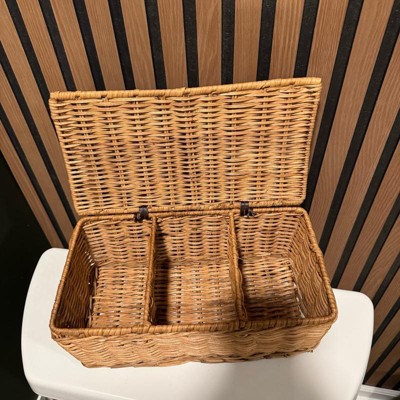 I bought this basket to go behind my toilet in my soare bathroom because I liked the way it had a few sections to store things as I’m limited to cabinet space in my bathroom. It’s good quality wicker, and it opens and closes very easily. This would be great to store things like cotton balls, q-tips, and other odds and ends.