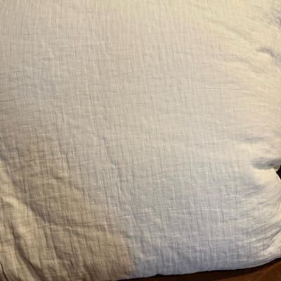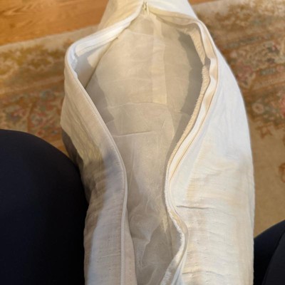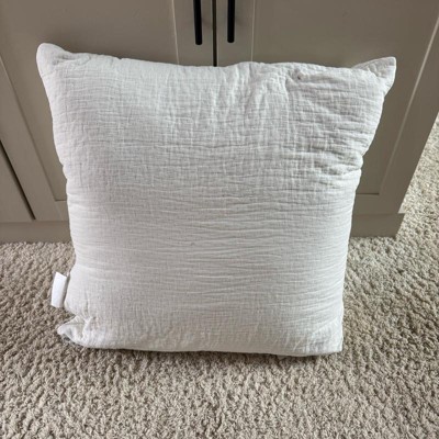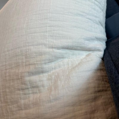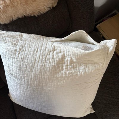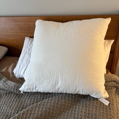 This euro sized pillow fluffed up beautifully right outside of the packaging. It is very soft and the gauze material is nice because it won’t get wrinkled. I love that. It has a zipper on the top so you could add more stuffing if you needed to. It seems like a good quality and would be good for a couch or a bed.