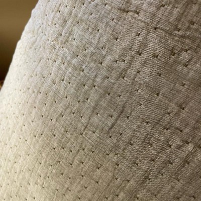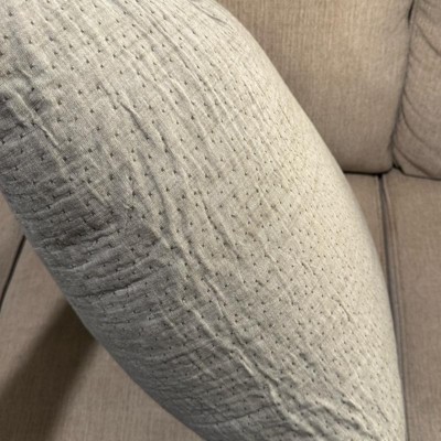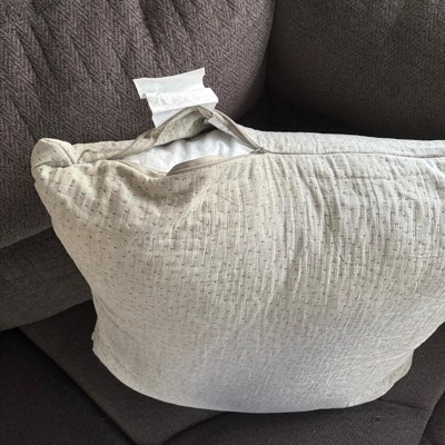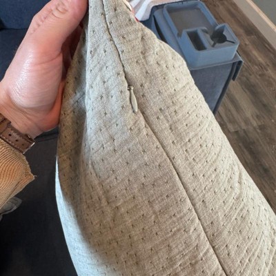 This very large throw pillow has a removable cover. On the bottom of the pillow there is a zipper, which makes removing the pillow insert very easy so you can wash this pillow cover, which is nice because it’s a light cover pillow. It has very small pin dots, which gives it a nice detail, which gives it an elevated look with not too much distraction if you wanted to add a patterned pillow next to it or quilt or blanket.