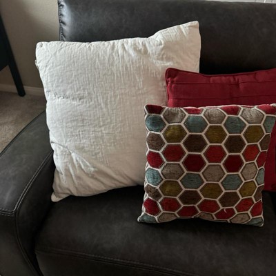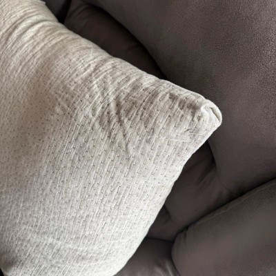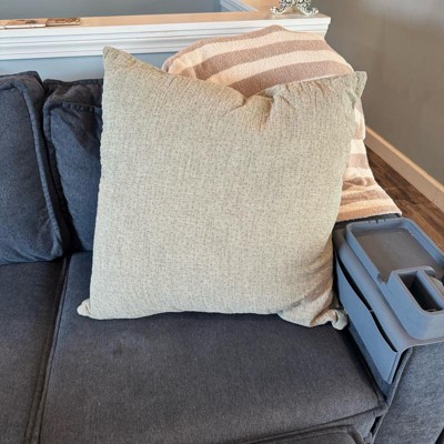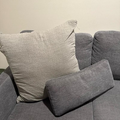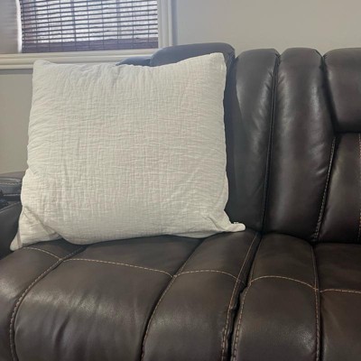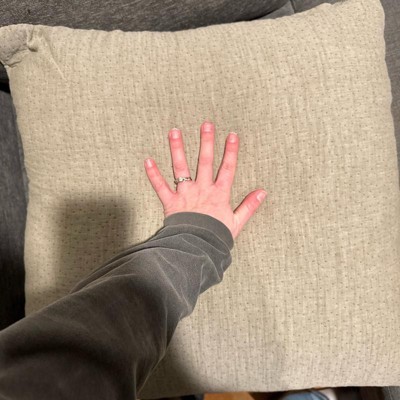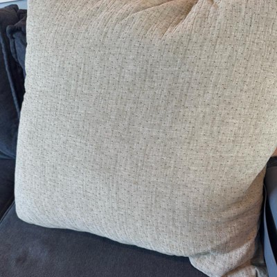 This is a large size throw pillow. It is square in shape and measures 26“ x 26“. It has a removable and washable cover that has a zipper closure. The pillow is very soft and has a textured dot design throughout. This is a great neutral color that matches any other type of home decor. This would look great on a recliner couch or loveseat.