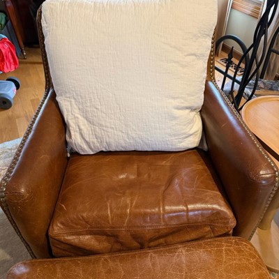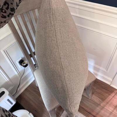 This is a 26 x 26 throw pillow with pin dots on them. This is kind of between a tan and a gray color and has a removable cover. I love that you can remove it and wash it easily. This can go with a brown or a gray color scheme very neutral and color very soft material . This is made by hearth and hand.