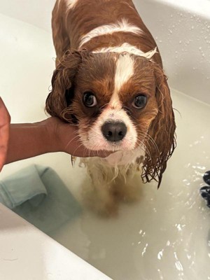 [This review was collected as part of a promotion.] My dog really enjoyed this. It has a wonderful blueberry scent that lasts even after rinsing off my dog. It is cruelty free and biodegradable which is important to me. My dog looked very fresh and clean after using, it didn’t seem to bother her eyes either.