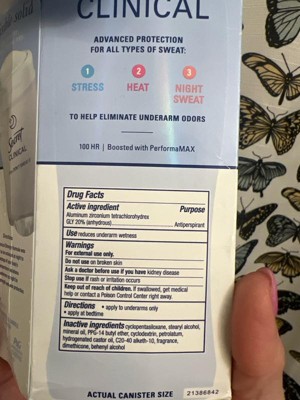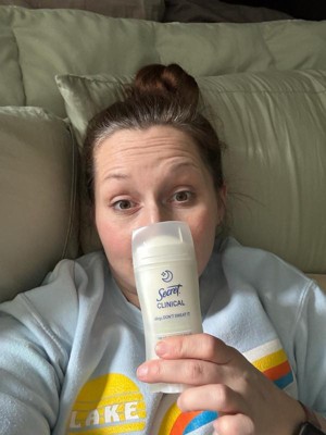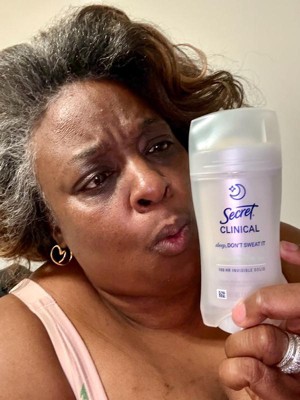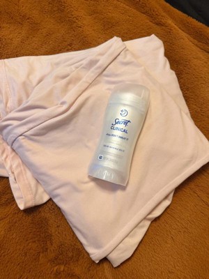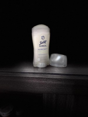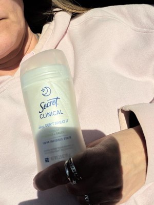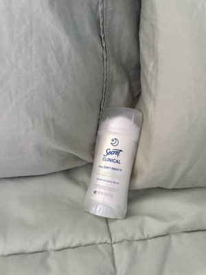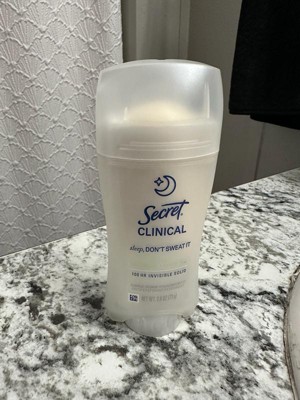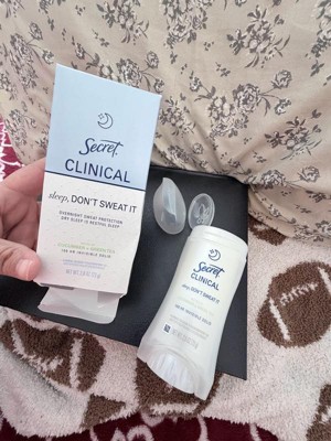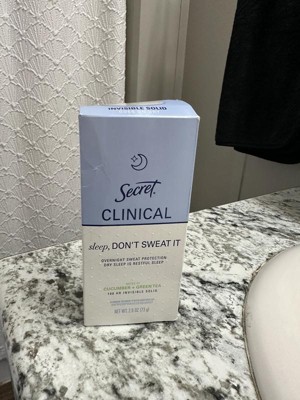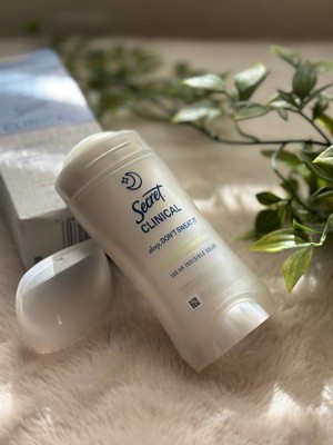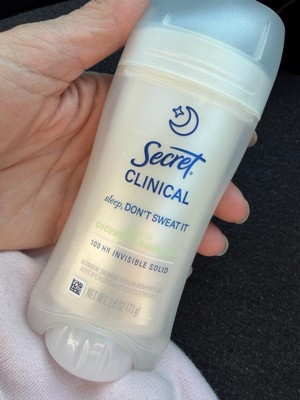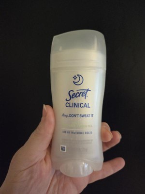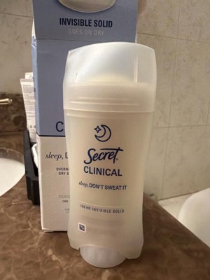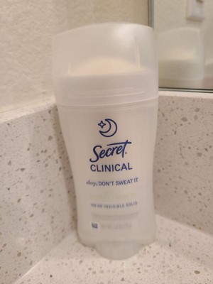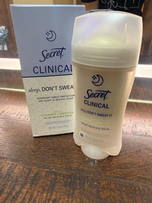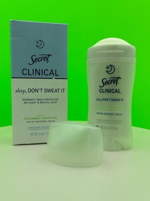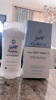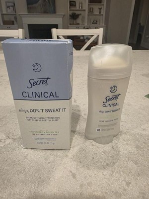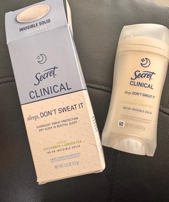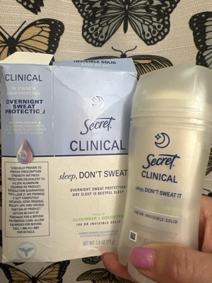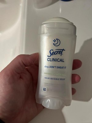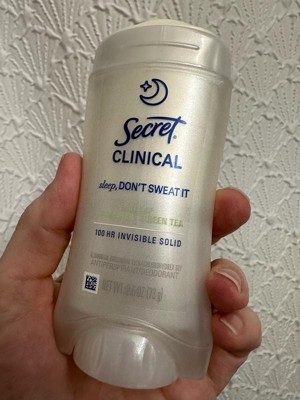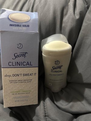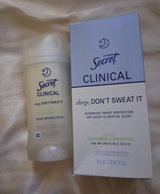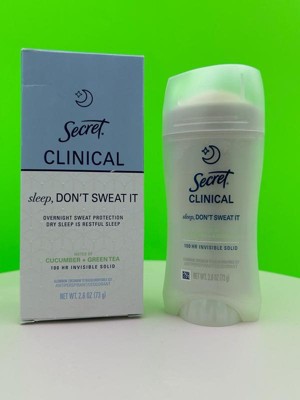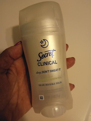 [This review was collected as part of a promotion.] This 2.6 oz secret clinical deodorant is ideal if you are looking for freshness and maximum protection. It has a super light aroma of cucumber and green tea that does not harass you when you sleep , and its long lasting formula ( up to 100 hours ) keeps you dry even after the morning shower. As it is an invisible solid bar it yields a lot of,so a single container will last you a couple of months using it every night