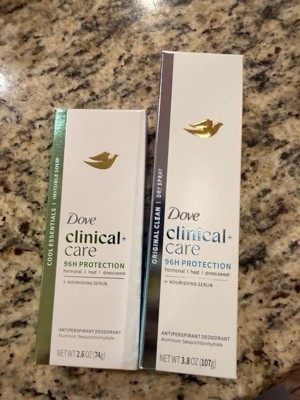 Meet Dove Clinical + Care Antiperspirant Deodorant, our best protection for hormonal, heat, and stress sweat. Designed for all of life's sweat triggers, this clinical strength antiperspirant deodorant dry spray delivers extra effective sweat protection for an impressive 96 hours. With its odor-fighting technology, you can feel fresh and confident throughout your day, no matter what challenges come your way. Ideal for long workdays, intense workouts, or travel, Dove Clinical + Care ensures you stay fresh and dry when it matters most. Enriched with 7% nourishing serum, Dove Clinical + Care has an advanced formula that not only helps repair the skin's natural barrier but also leaves your underarms feeling soft, smooth, and irritation-free – even after shaving. Dove is the #1 dermatologist recommended antiperspirant deodorant brand and combines powerful protection with gentle care, making it an ideal deodorant for sensitive skin. This clinical antiperspirant deodorant features a long-lasting, crisp and clean fragrance, elevating your daily routine. Dove Clinical + Care is easy to apply: simply shake well, spray on your underarms from 6 inches away, and enjoy instant dryness with lasting comfort. As part of Dove's commitment to care, this Dove Clinical + Care is PETA Approved Vegan. Globally, Dove does not test on animals.