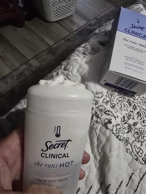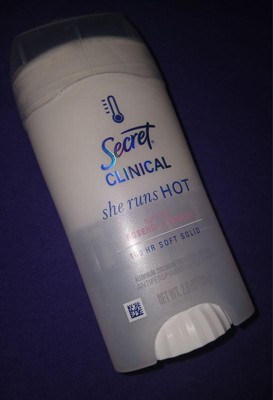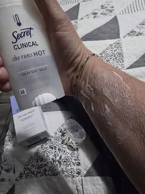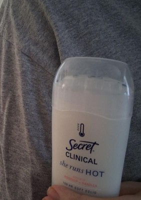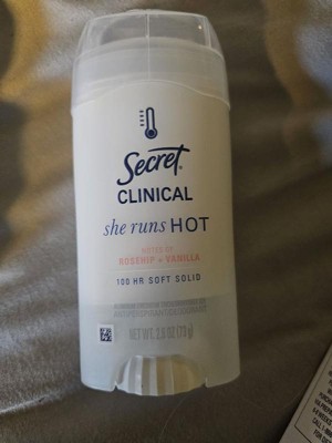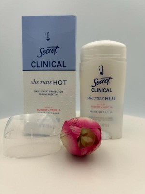 [This review was collected as part of a promotion.] It is hard for me to find a deodorant that will actually keep me dry for most of the day. After trying the secret clinical she runs HOT anti-perspirant/deodorant, I think I finally found the one. First of all it smells so good with notes of Rosehip and vanilla.. I have never tried a soft solid deodorant until this, and I really like it.. It actually lasts up to 100 hours, even though I never go that long without a shower, but I really believe that it would work for that long. Secret is a fantastic company. I have been using it for over 40 years.