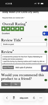[This review was collected as part of a promotion.] Topbox Marketing allowed me to test for free and review this amazing Olay body wash. Olay makes such grat products and this is no exception. Soft on my skin as no irritating my skin like some body washes do. Pleasant scent and felt good on my skin making cleanup more relaxing.