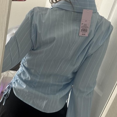 Poplin shirt from Wild Fable™ with long bell sleeves. Features a collared neckline, full button placket front and ruching down the sides with adjustable tie fastening. Tailored in a slim-fit silhouette with a mid-length hemline. Crafted from lightweight cotton with spandex for comfortable wear that moves and stretches with you.