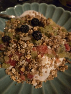 [This review was collected as part of a promotion.] This is great granola! I put it in my plain Greek yogurt to flavor it up and add texture. I like the dried blueberries in it a lot. Its definitely made breakfast better