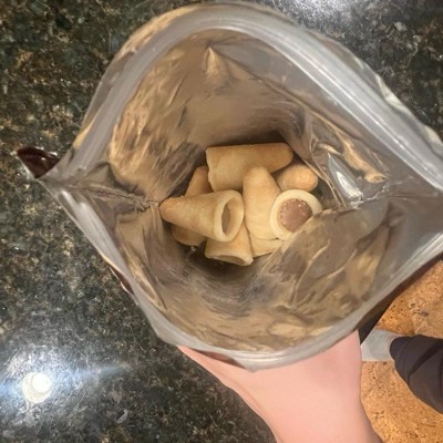 Every cone bursts with creaminess. The contents go all the way down the tips. Each piece is generously filled and every bite oozes with hazelnut cocoa. The soft, shortbread cookie cones kept their shapes. The bag did not have any broken pieces. The packaging is both easy to open and re-seal. It was hard to stop at one piece for tasting. Great for snacking with a cup of coffee.