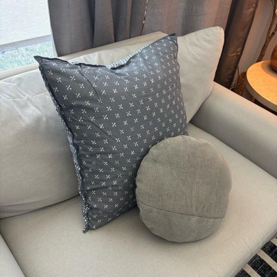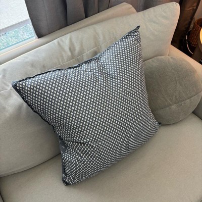 This is the Hearth and Hand 26 inch block pattern square throw pillow in blue. The material is soft and the filling is comfortable. This pillow looks expensive. I love that it has 2 different prints, so you can just turn it over and you have a different look. The pattern is modern, but not too busy. I like the blue piping as well along the edges.