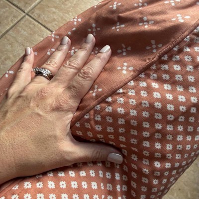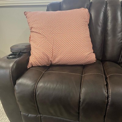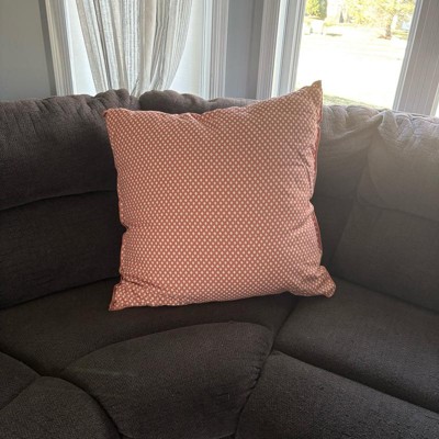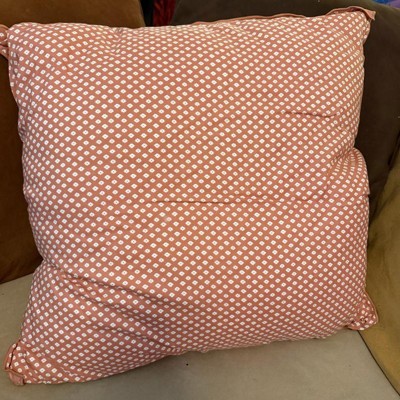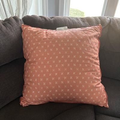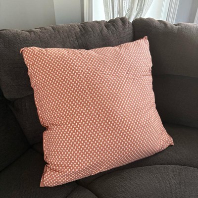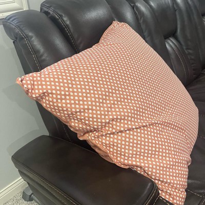 I love this rust colored block pattern throw pillow a lot. It measures 26 inches by 26 inches which ended up being even larger in person than I had originally thought, but I do like it in my chair. It is pretty soft, even though it’s durable and a a tad stiff. I love that the cover you can unzip and wash. Nice buy!