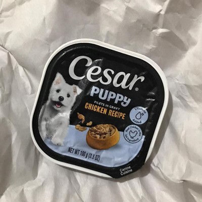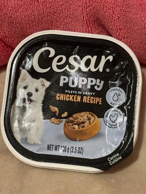 [This review was collected as part of a promotion.] My small Yorkie loves this Cesar puppy chicken recipe wet dog food. It has filets in gravy which she loves. She ate the whole container in just a few minutes.