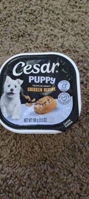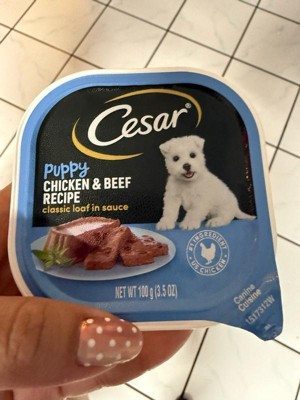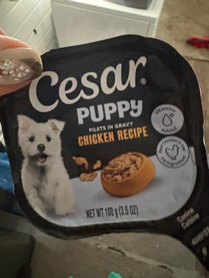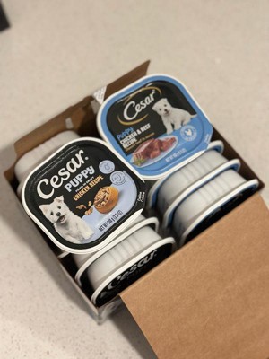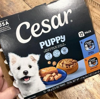 • 12-Pack: Contains six (6) 3.5 oz. trays of Cesar Puppy Wet Dog Food Classic Loaf in Sauce Chicken & Beef Recipe, and six (6) trays of Cesar Puppy Wet Dog Food Filets in Gravy Chicken Recipe.