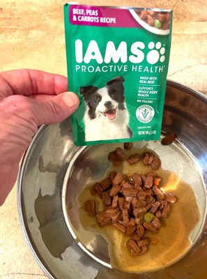 [This review was collected as part of a promotion.] I received this product for free in exchange for my honest review from Influenster and Iams. My dogs LOVE this food. I give them a pouch of this food each and they eat every bite. It is very moist and smells like vegetable stew! I feel like if you have a small dog this would be a very good, cost effective food, but for my large dogs I would need larger pouches to feed them exclusively this. With all that said, I would still happily buy this again for my dogs to enjoy as a treat in addition to their normal food!