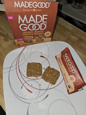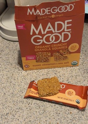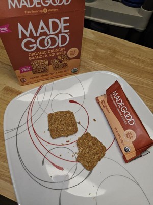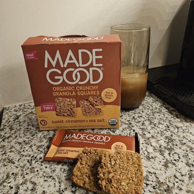 [This review was collected as part of a promotion.] I decided to try these with my morning iced coffee, and the absolute winner ingredient here is the sea salt. I am more of a savory gal myself, so having the sea salt to balance the sweet is a must for me and it is done tastefully with these. I am also more likely to grab soft granola from the shelf, but this crispy granola isn't hard to chew. I find that I'm exhausted by the time I eat some hard granola 😅 but I didn't find that with these Made Good squares. The cinnamon is also perfect as I don't find cinnamon particularly sweet, more spicy, so this again is the perfect morning snack for me. There is sweetness to the granola, but it isn't overpowering. You are left to taste the actual ingredients instead of a cocktail of many. Love these and that they are organic as well! While I'm not gluten intolerant, it is nice to take a break from gluten, so that is nice also. Overall, I had no complaints with these.