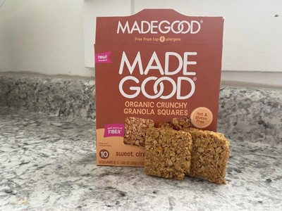 [This review was collected as part of a promotion.] I received MadeGood Organic Crunchy Granola Squares Sweet Cinnamon & Sea Salt Snack Bars in exchange for my honest opinion. They are one of my favorite grab-and-go snacks! I love the sweet cinnamon and sea salt flavor. It’s perfectly balanced and satisfying. The texture is delightfully crunchy without feeling too hard (albeit a little crumbly), and they’re the ideal size for a quick snack between meetings, errands, or workouts. I love that they feel like a treat but are still something I can feel good about eating. Added bonus that I can send them this my son to school or have them in my snack bin without having to worry about allergens. Overall, a tasty and wholesome snack that I’d definitely repurchase.