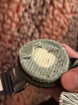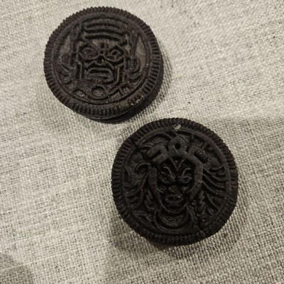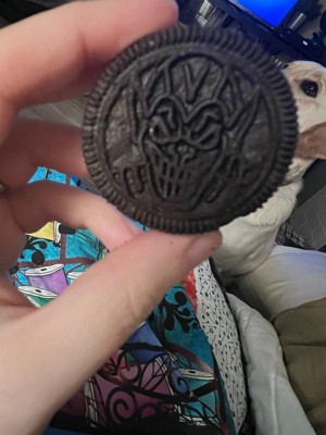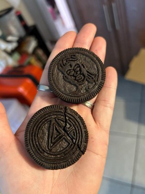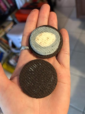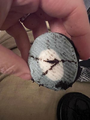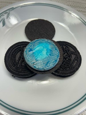 [This review was collected as part of a promotion.] I received this product for free from Influenster and OREO in exchange for my honest review. The design detail on these OREO cookies are great! They taste like a OREO cookie. The color changing on the filling is very staining. I washed my hands with soap and my finger is stained blue.