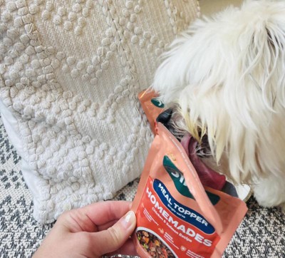 [This review was collected as part of a promotion.] I was given this product in exchange for my honest review. My six year old havanese mix, Juju, loves the chicken and salmon homemades. I use them on top of her dog food to give her extra nutrients and also as a standalone treat. It looks like human food and she cannot get enough of it. I love the convenience of the single serve packaging making it so easy to take with me on hikes or road trips.