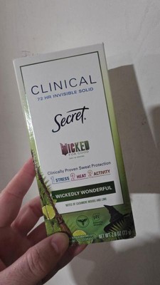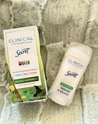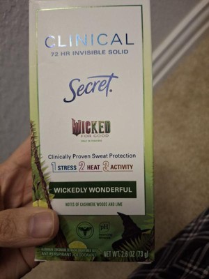 [This review was collected as part of a promotion.] I’m obsessed with the Secret x Wicked collab! The cashmere, wood, and lime scent feels like a high-end perfume. It’s incredibly durable, lasting through workouts and busy days without needing to reapply. The invisible solid provides smooth coverage with zero irritation on my sensitive skin. Best of all, it dries instantly with no sticky residue or white streaks on my black tops. It’s the perfect mix of magic and heavy-duty protection!