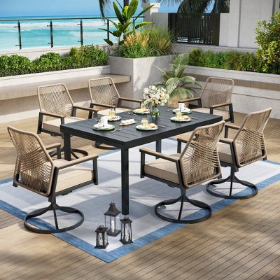Captiva Designs 9pc Patio Slat-top Square Metal Dining Table and Blue Padded Sling Swivel Chairs