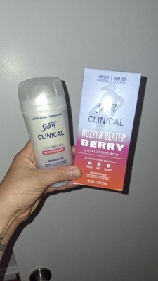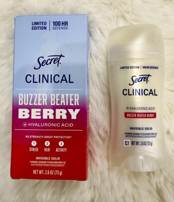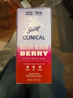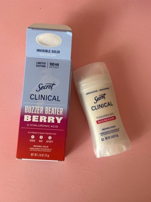 [This review was collected as part of a promotion.] Thank you Influenster and Secret for sending me this product free of charge in exchange for my honest opinion. Secret Clinical Invisible Solid Buzzer Beater in the Scent of Berry has the strength of many hours due to the hyaluronic acid. It is a deodorant for women. Invisible solid. Helps you stay fresh. Keeps odors at bay.