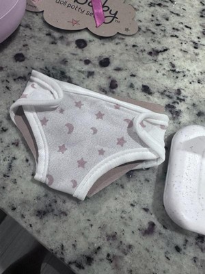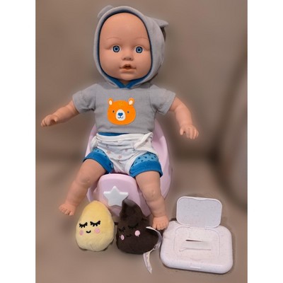 [This review was collected as part of a promotion.] The LullaBaby Pink Potty Set is super adorable it fits a nice size doll perfectly and comes with a cloth diaper , a container with a wipe sticking out and a stuffed number 1 and 2 . The potty makes little sounds and plays music and my toddler has loved playing with it . It's a great toy to introduce potty training to your children.