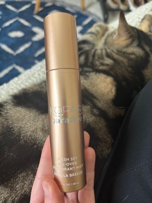 Love the pretty gold, sleek and travel friendly (2.7 oz) bottle, yay! Product works well to keep you odor free! Dries quickly and clear. Received the vanilla breeze scent, disappointed in the actual scent, doesn't give vanilla or much of any thing. I love Kopari products, this is the first that lacked robust aroma. Will likely try the coconut cream or watermelon sugar next time!