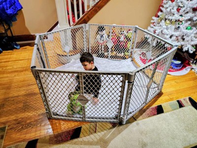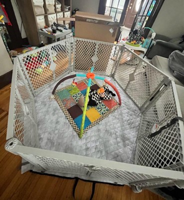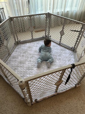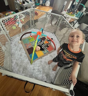 [This review was collected as part of a promotion.] I love this item because it will grow with my son! We have four little dogs who are always eager to play with him, which makes tummy time or using his swing a bit challenging. This gate has been a lifesaver—I can safely put him in his swing or lay him down while I get things done, like washing dishes, without constantly shooing the dogs away. I’ll keep using it once he starts crawling—it’ll be perfect for keeping him entertained with toys and learning activities before his morning nap. The included attachable mat is another great bonus. I didn’t show it in the photos, but it adds a nice cushion and keeps him off cold floors, especially if you have wood.