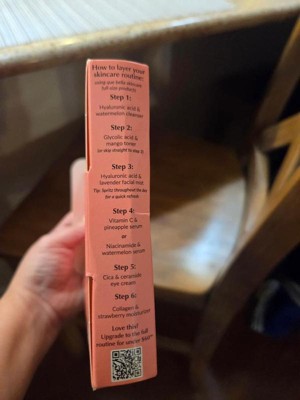 Wow! I got these sample sizes from the UK to test them out! These samples gave me a few days worth of products to test, which is great! 1) The cleanser is so fresh, and smells really good! It doesn't dry out my skin. My skin feels clean and soft after using it. 2) Toner came in a round pad, soaked with toner, that has hyaluronic acid & lavender. So I could use it for a few days. It smells really relaxing. 3) Eye cream with cica & creamide has a lift, creamy texture, just a little goes a long way. It feels moisturizing and not oily. 4) Niacinamide & Watermelon serum, which hydrates & refresh. It really smells watermelon! This serum comes in a clear gel format, and is light, easy to spread. Just that it takes time to be absorbed, so it did feel a bit sticky. 5) Collagen & Strawberry Moisturizer has a semi creamy texture. It looks like a cream, but it felt different when I spread it on my face. It was kinda hard to spread and has a white flake feel. I had to use small amount in oder to make it spread nicely, not creating any flakes. It takes a little while to be absorbed. It's a bit sticky too. 6) Vitamin C & Pineapple serum, which brighten and plump skin. The serum is also a clear gel and strong pineapple fragrance. It gets sticky for a bit longer than others, so maybe it will work for a nighttime routine when you have time to wait for it to be absorbed. This whole series of skincare reminds me of a tropical vacation! I recommend all of them!