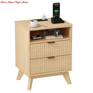 Bring style and smart charging to your bedside with this fluted nightstand. Its wave-textured drawer fronts and slim metal pull add modern flair, while an integrated power strip¡ªtwo outlets and two USB ports¡ªkeeps lamps and devices powered without extra cords. Two smooth-glide drawers and an open cubby corral books, remotes and more. Crafted from durable engineered wood with solid wood legs and protective floor pads, it stands up to everyday use. Arrives with labeled parts for quick, worry-free assembly.